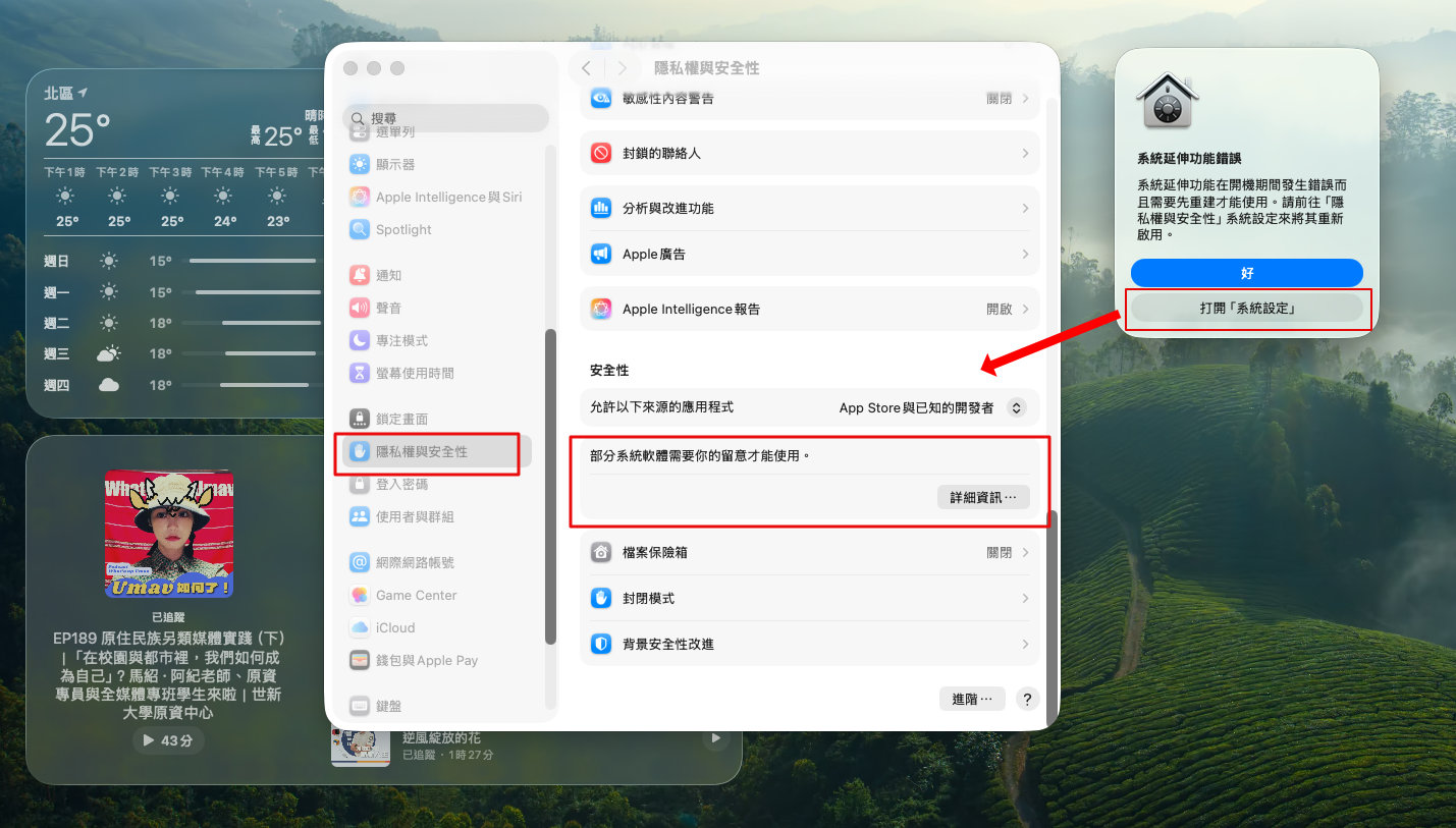最近在更新 Mac 系統後卻一直出現「系統延伸功能錯誤」的錯誤訊息,查詢了一下才知道原來是安全性需要做重新啟動的動作,只要跟著底下的步驟操作就可以解決這個錯誤訊息。